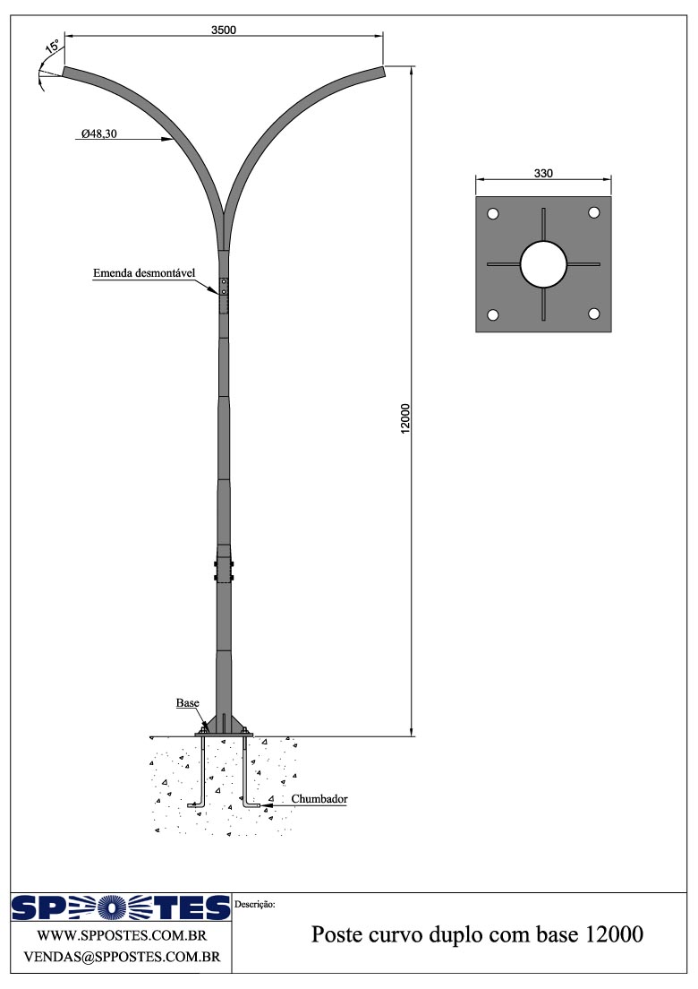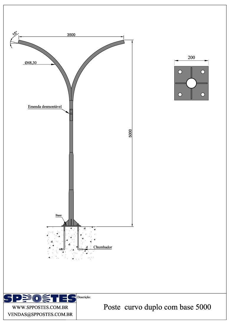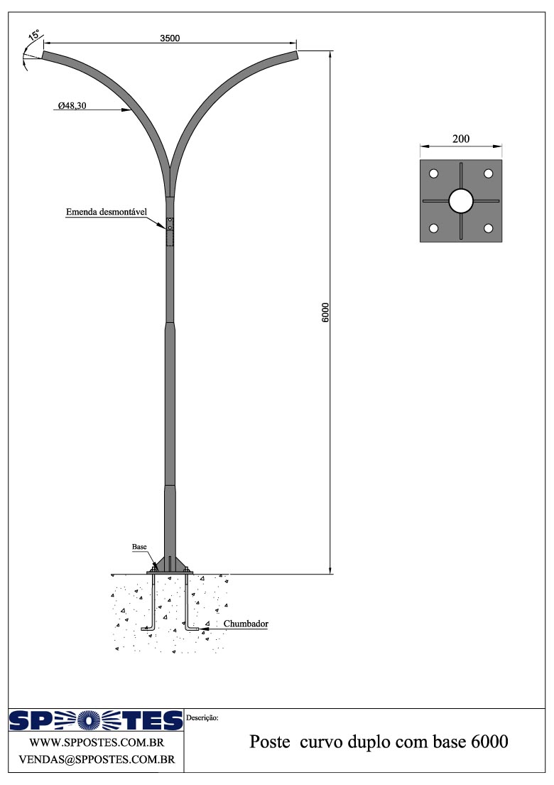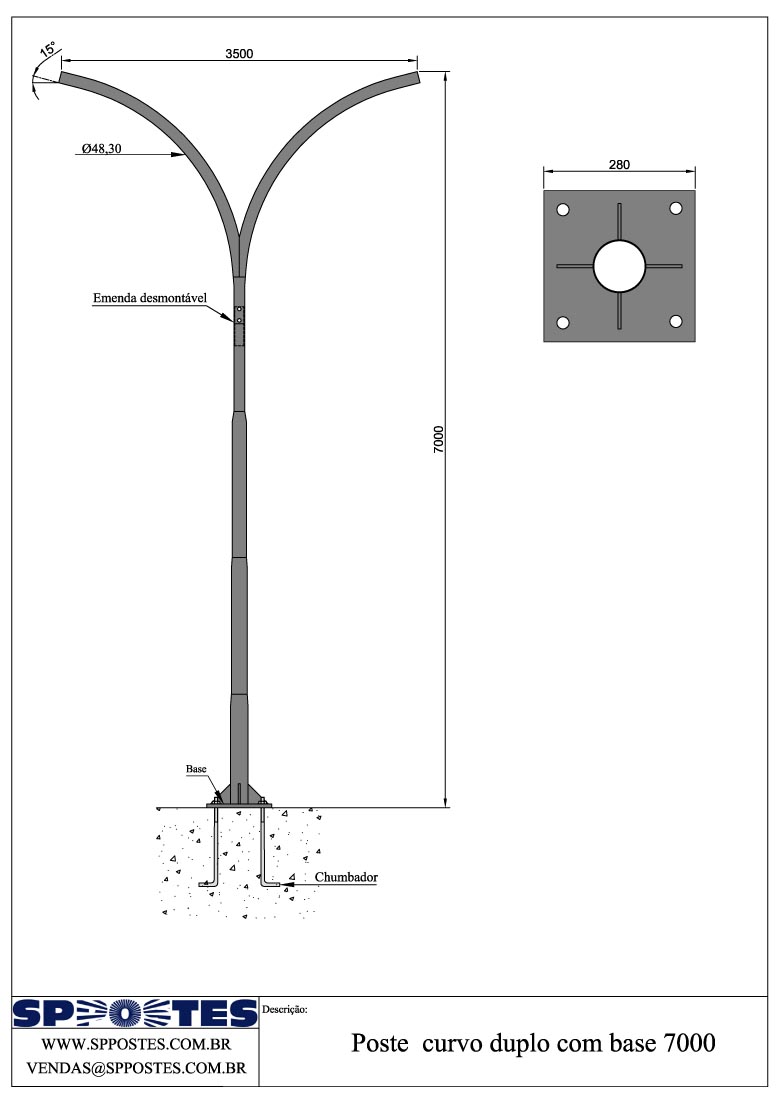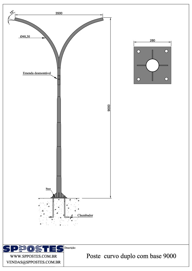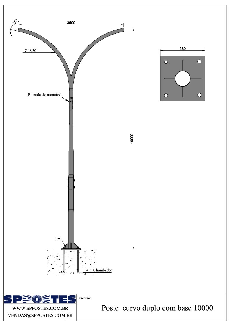 Postes curvo duplo com base e chumbadores, dimensões em milímetros, galvanizados a fogo, tolerância geral de 2%, poste de iluminação dentro da Norma ABNT 14.744 – Válida a partir e 29/10/2001, ruptura vertical/Horizontal 100DAN sem ruptura.