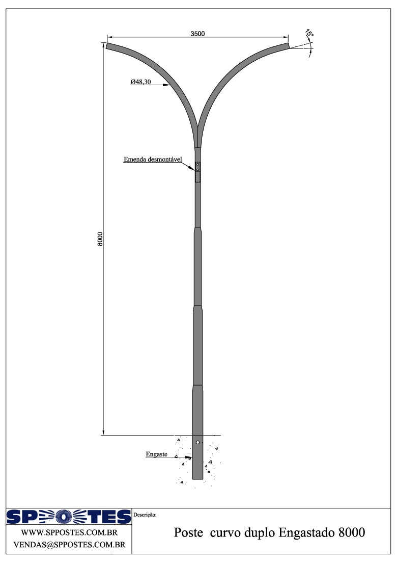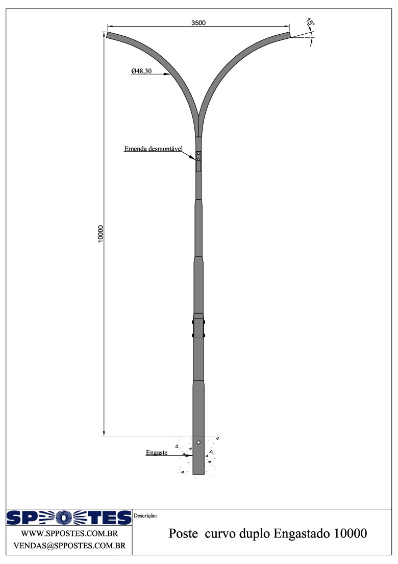Postes curvo duplo engastado, dimensões em milímetros, galvanizados a fogo, tolerância geral de 2%, poste de iluminação dentro da Norma ABNT 14.744 – Válida a partir e 29/10/2001, ruptura vertical/Horizontal 100DAN sem ruptura.